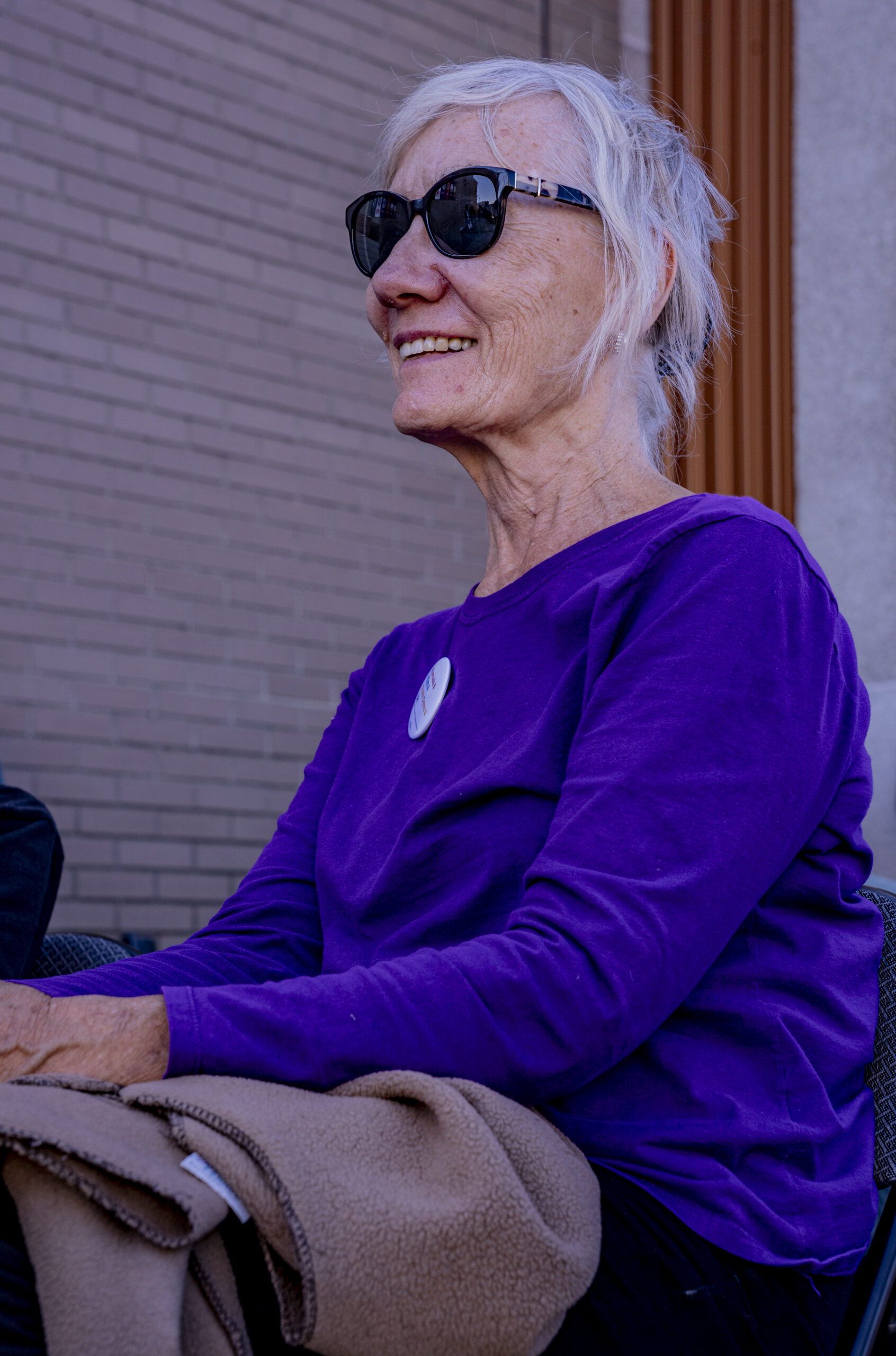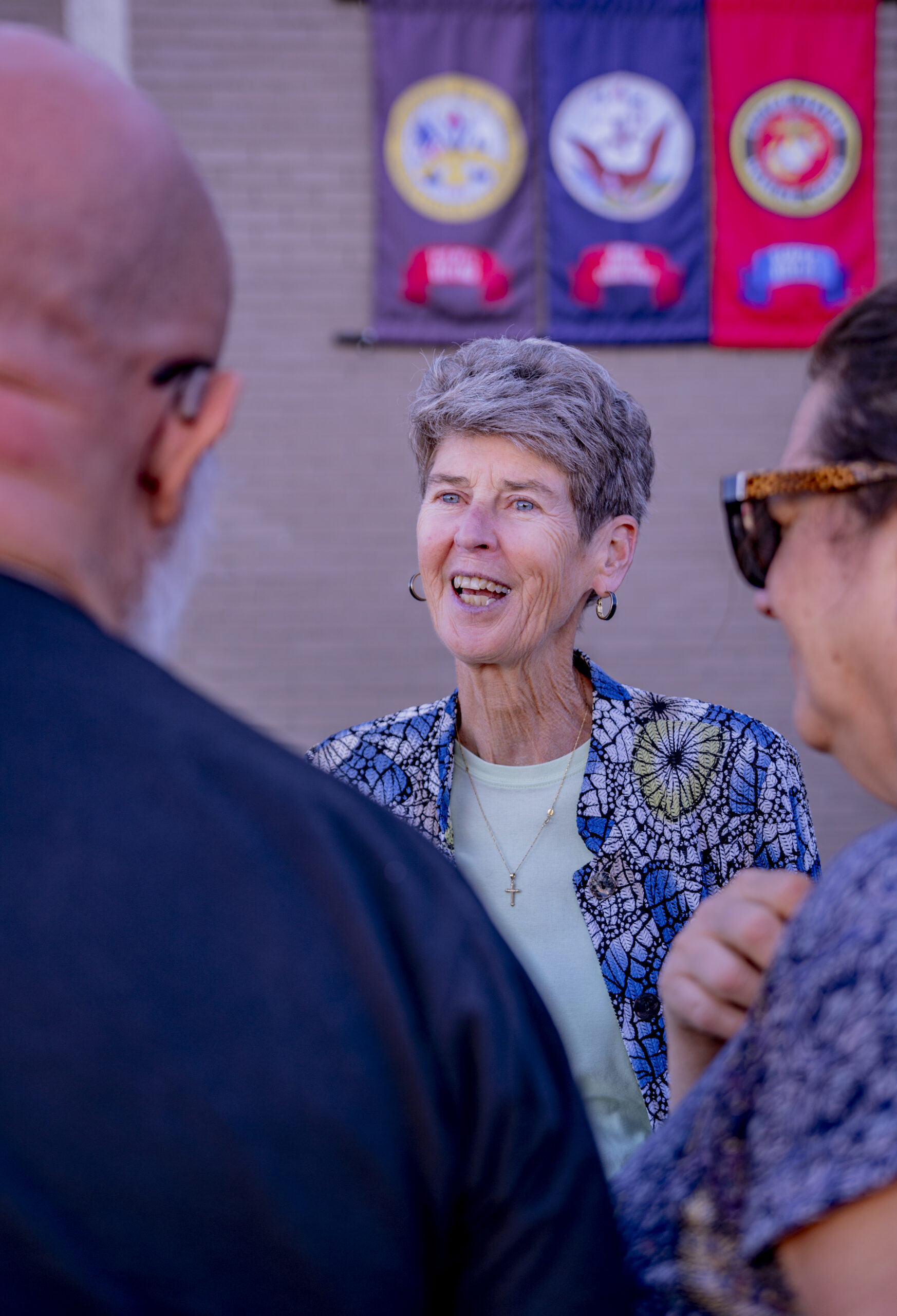 - Bus rider Sr. Sally Duffy, SC, speaks with rally attendees.