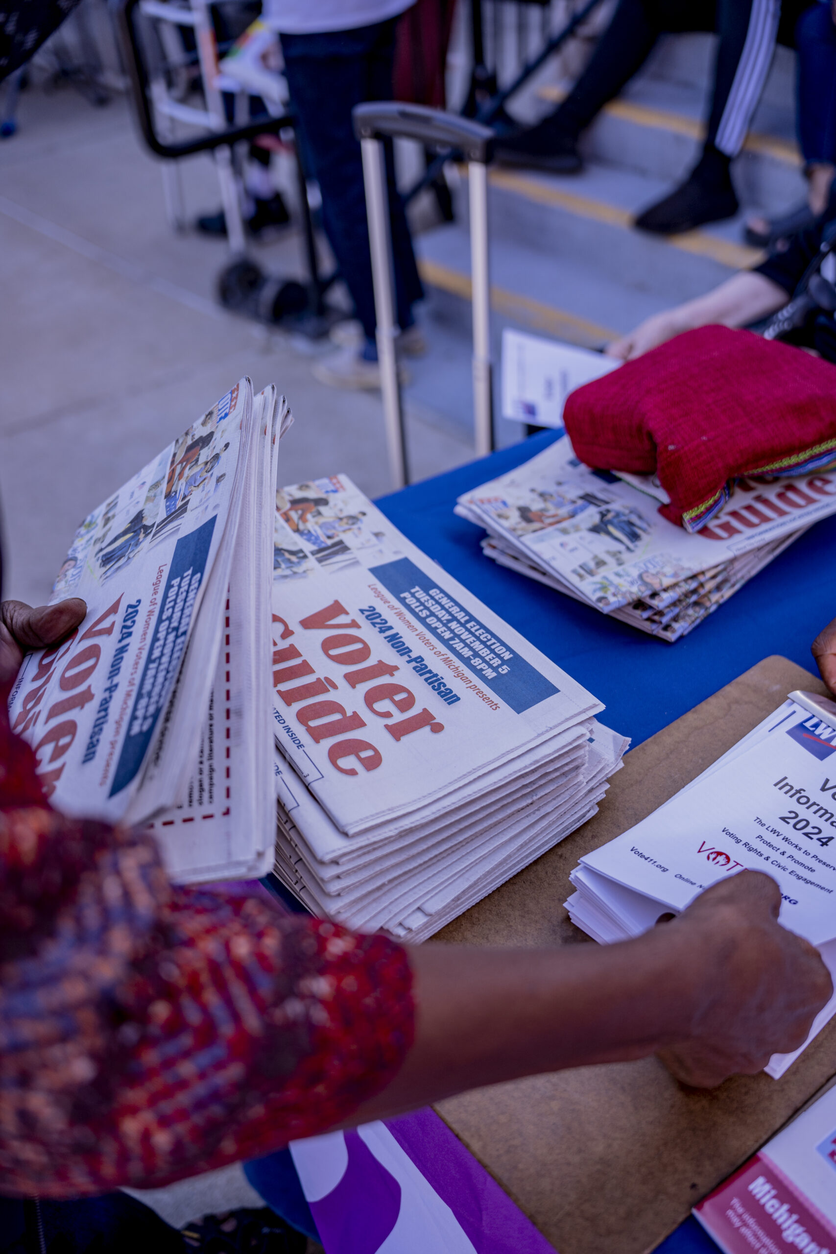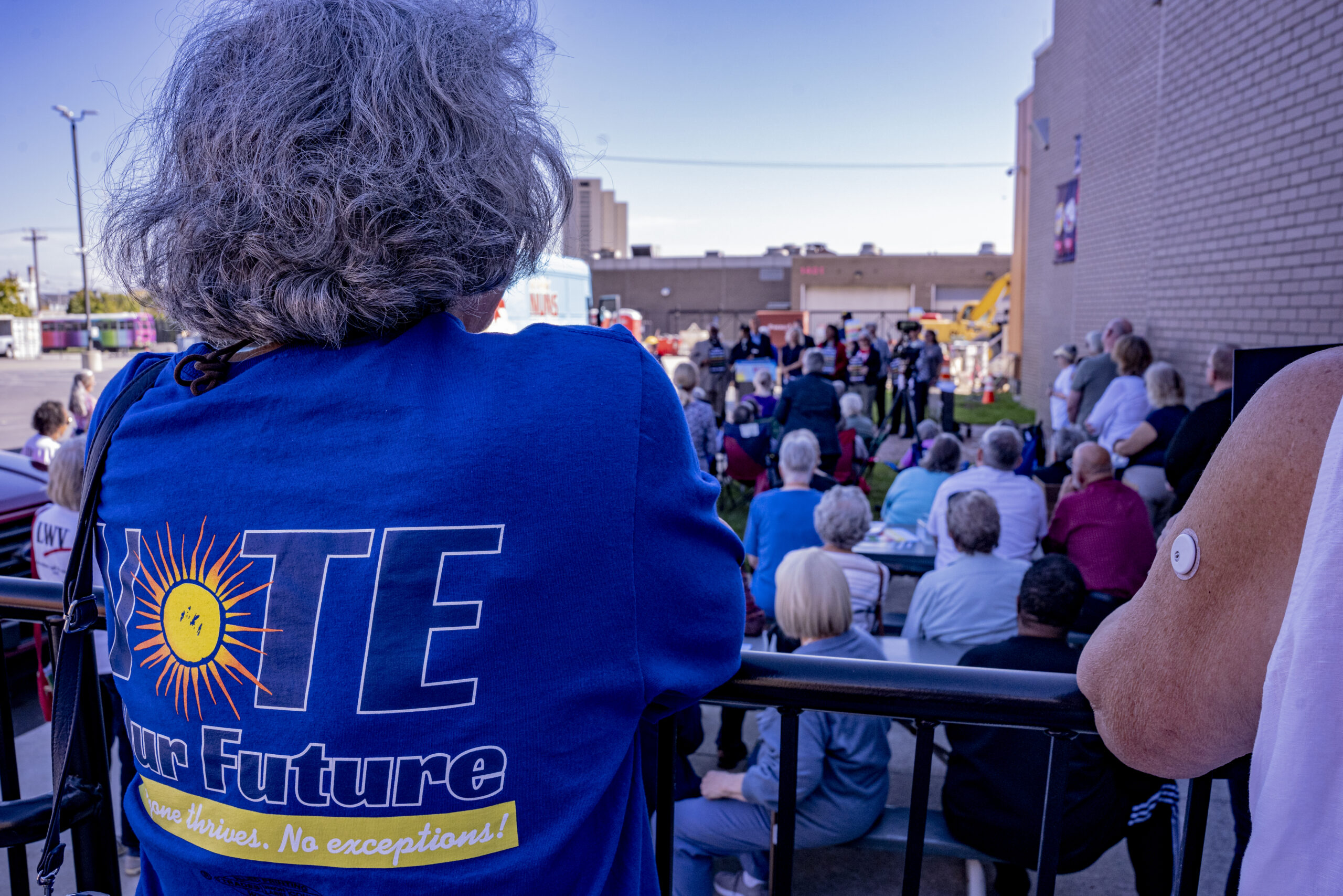 - Sheryl Theriot, League of Women Voters, speaks at the Vote Our Future rally in Detroit.