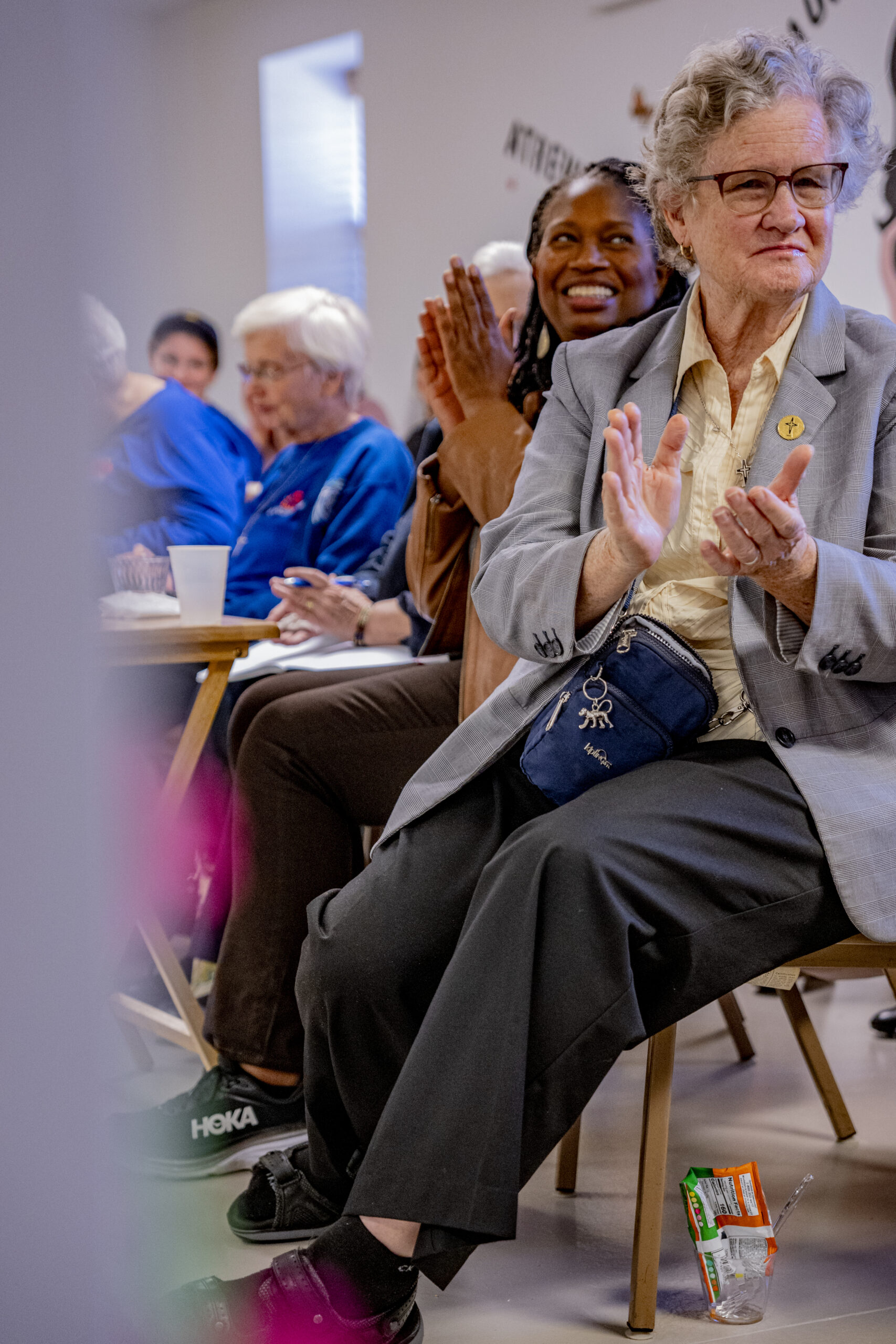 - Rev. Dr. Leslie Copeland-Tune and Sr. Catherine Darcy, RSM applaud during a presentation at Circle Resource Center in Chicago during the site visit by the Nuns on the Bus & Friends on Oct. 8.