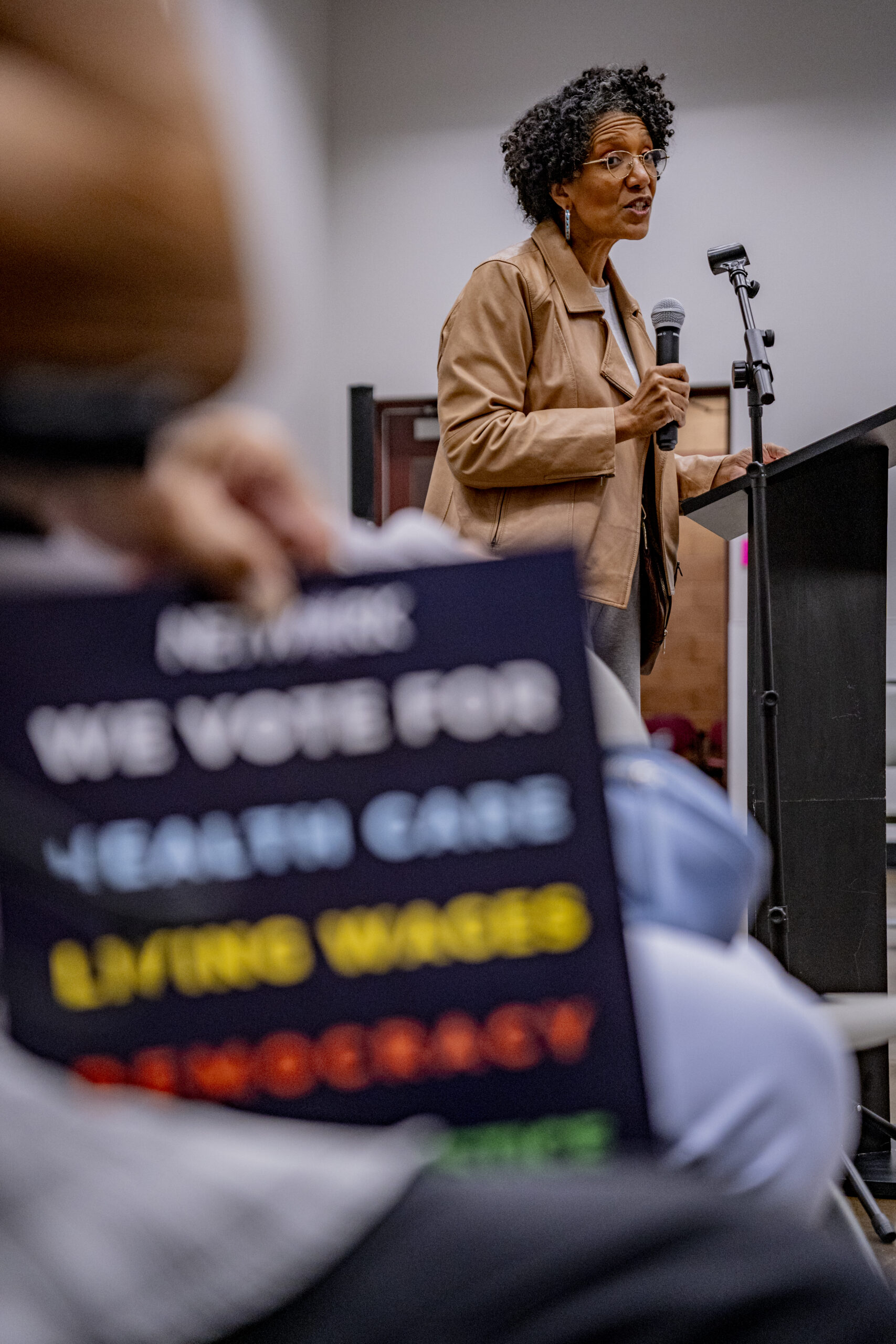 - Bus rider Lisa Sharon Harper speaks at the town hall.