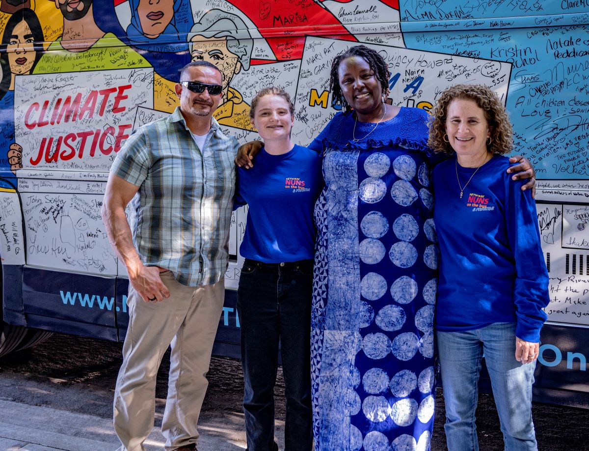 - Dan from the Nuns on the Bus & Friends tour, Chelsea Puckett of NETWORK, Sr. Mumbi Kigutha, CPPS, and Margie Clark of NETWORK stand by the bus during the site visit to the St. Francis Center in Redwood, CA on Oct. 17.