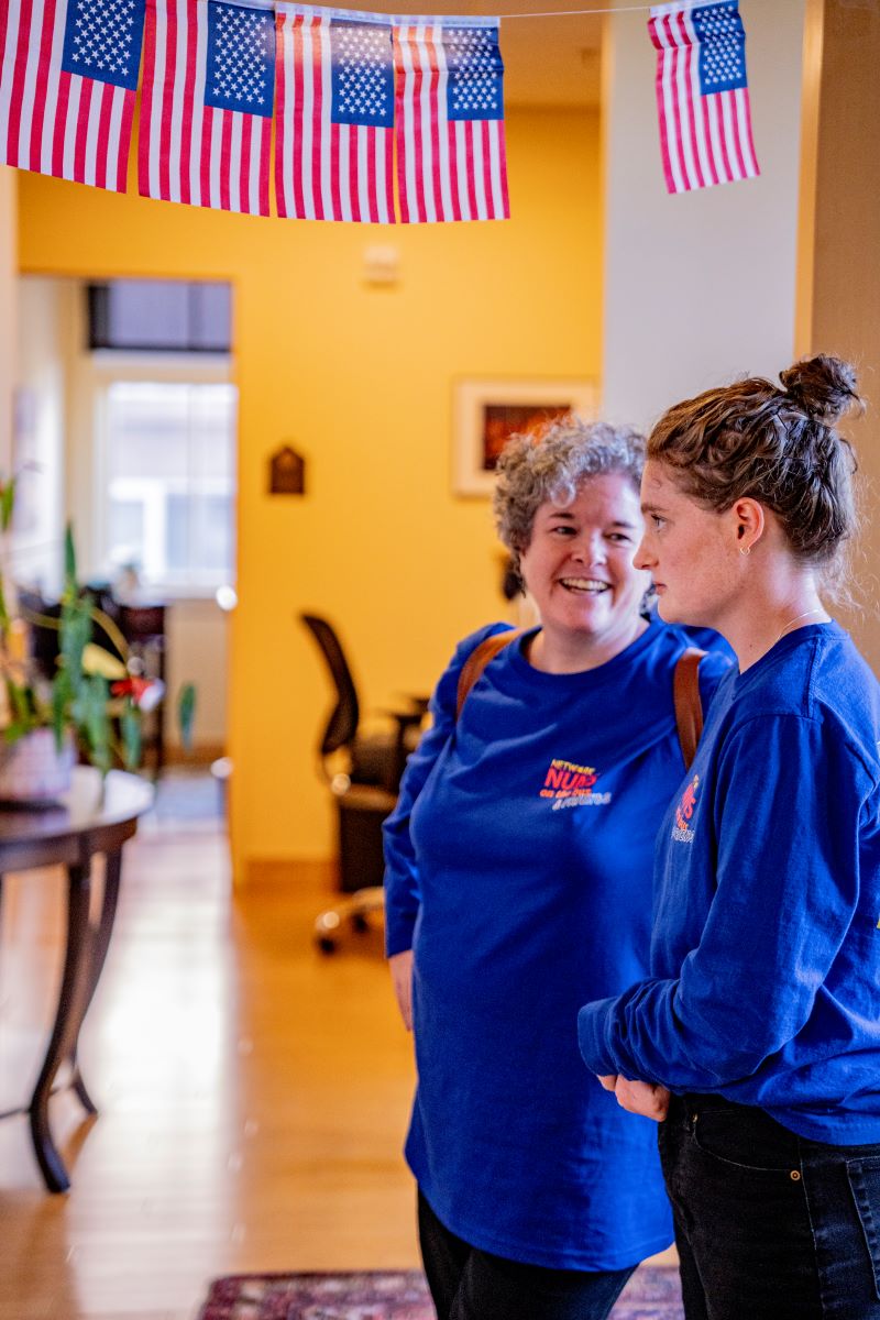 - Kate Young, Executive Director of the St. Francis Center, welcomes the Nuns on the Bus & Friends during their Oct. 17 site visit.